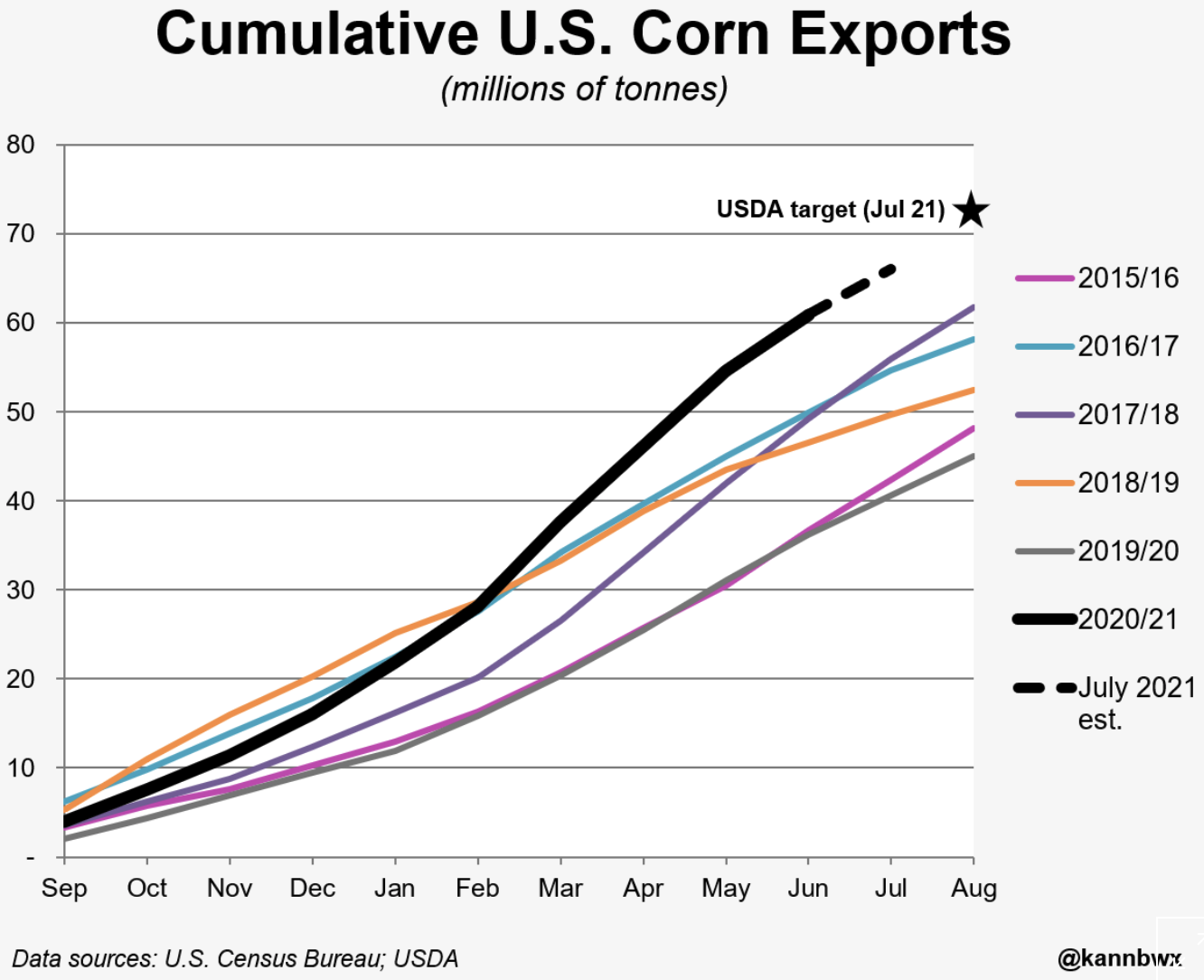 La più recente stima per l’export USA di mais nella stagione 2020/21 prevede un volume di 72,4 milioni di tonnellate ma, di queste, fino a luglio ne risultano spedite solamente 66 milioni circa e questo implica che, per raggiungere il target previsto dall’USDA, nel solo mese di agosto dovranno essere spediti altri 6 milioni, un uovo record.
